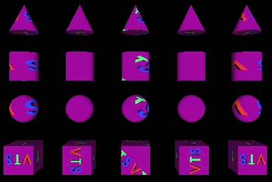 | description | Test rotation field for ImageTexture mapping to primitive geometry. Test browser ability to apply rotations of (left to right) -180, -90, +45, 90 and 180 degrees to an ImageTexture mapped to the faces of primitive geometry, mapping with mapping rules. The result is (for all geometry faces): the first column of geometry should show the VTS logo upside-down and spelling to the left for all faces. The second column of geometry should map the VTS logo with the positive horizontal direction pointing up, and the positive vertical axis pointing left. The third column should map the VTS logo right side up, on a downward 45 degree angle. The fourth column should map the VTS logo vertically downward, with the +T direction to the right. The fifth column should be identical to column #1. |