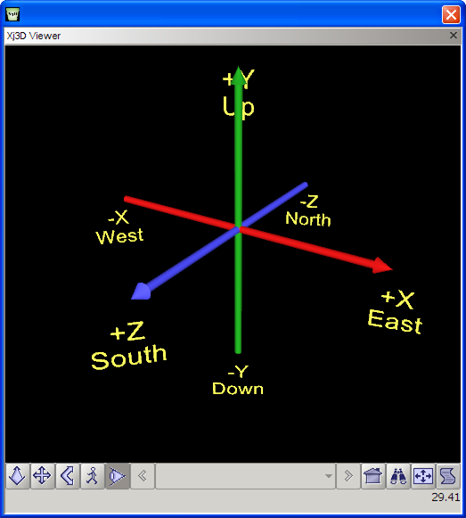 | 28 | <!-- From X3D Abstract Specification 25.3.3 GeoLocation: "In addition to placing a X3D model at the correct geospatial location, the GeoLocation node will also adjust the orientation of the model appropriately. The standard X3D coordinate system specifies that the +Y axis = up, +Z = out of the screen, and +X = towards the right. The GeoLocation node will set the orientation so that the +Y axis is the up direction for that local area (the normal to the tangent plane on the ellipsoid), -Z points towards the north pole, and +X is east." --> |