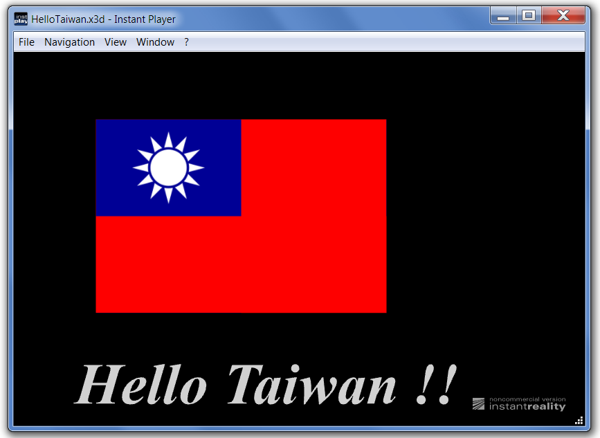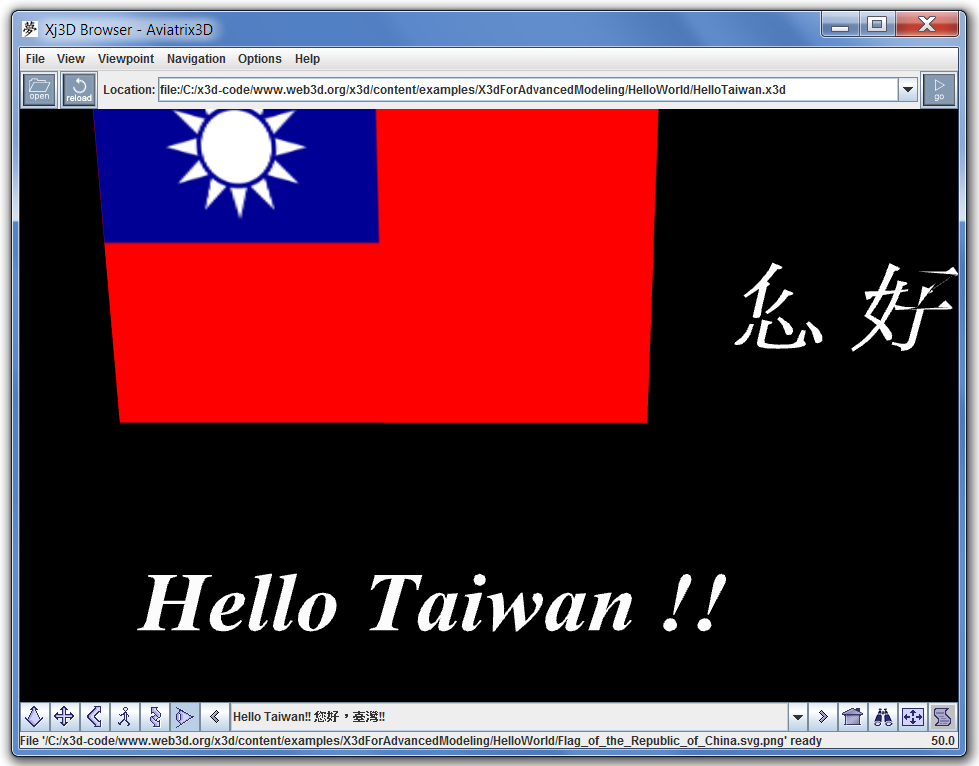 https://sourceforge.net/p/x3d/code/HEAD/tree/www.web3d.org/x3d/content/examples/X3dForAdvancedModeling/HelloWorldScenes/HelloTaiwan.x3d -->